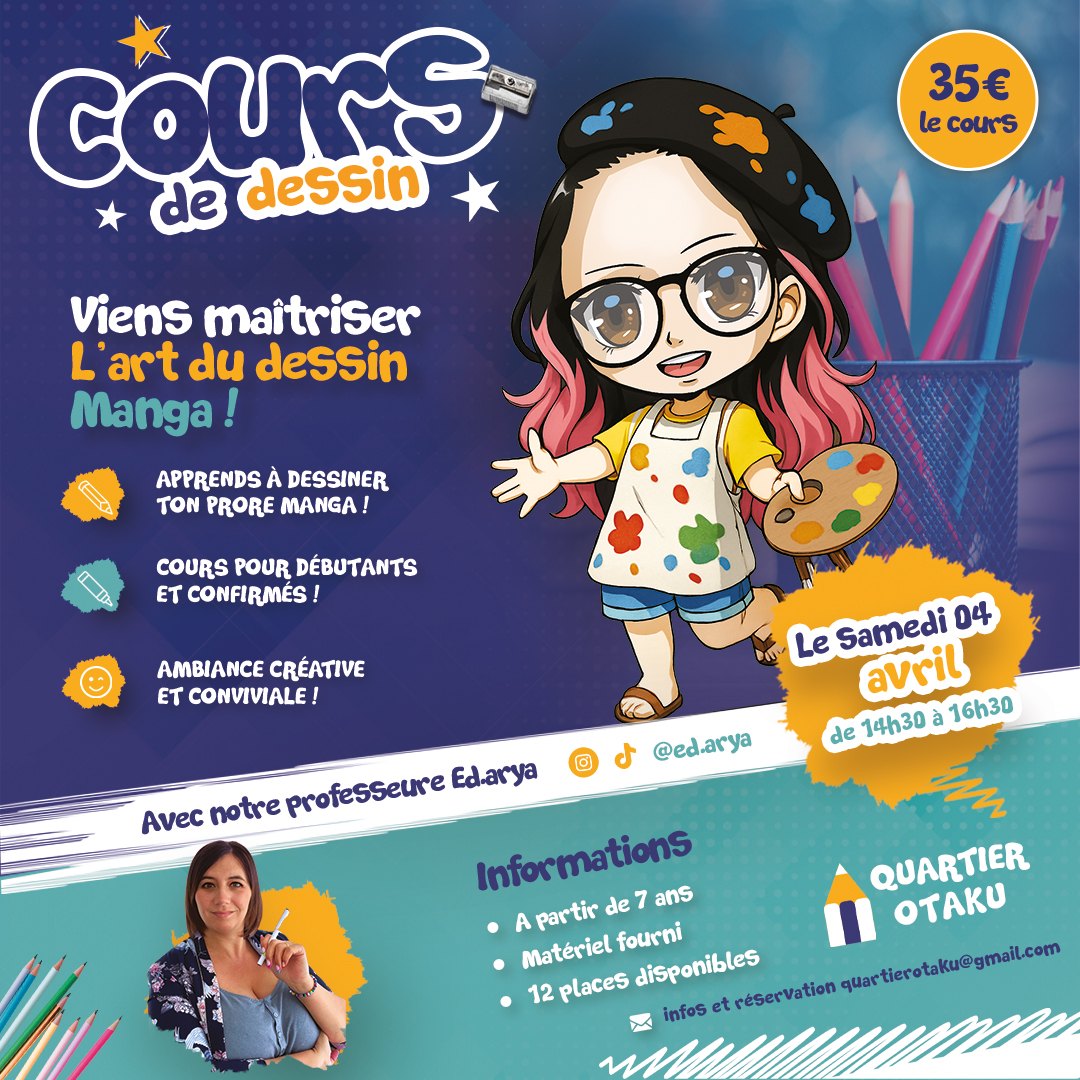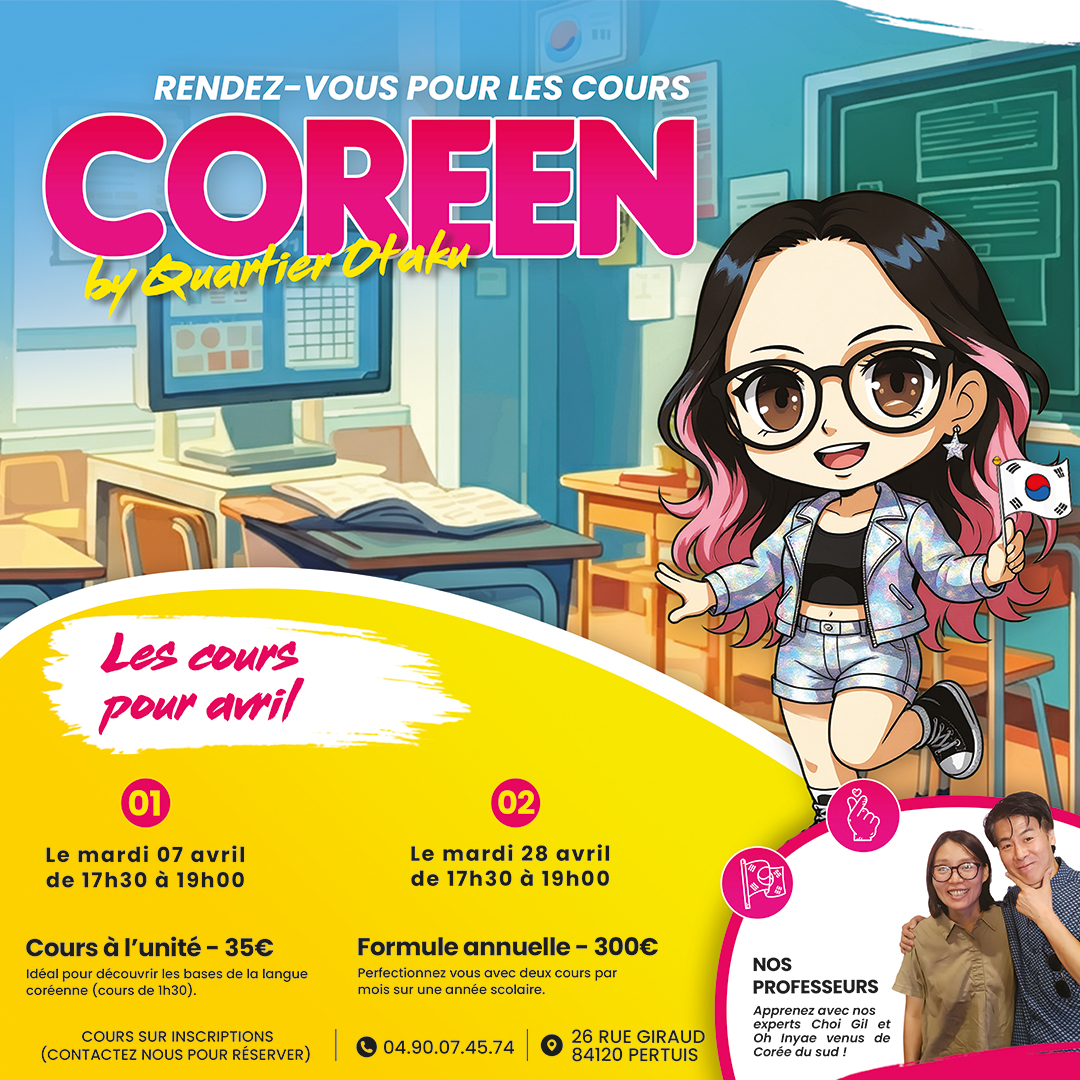 Quartier Otaku vous propose de plonger dans l’univers de la culture et de la créativité grâce à nos cours mensuels. Que vous soyez passionné de dessin, curieux d’apprendre le japonais ou attiré par la langue coréenne, chaque discipline a été pensée pour vous offrir un moment d’apprentissage agréable et motivant.