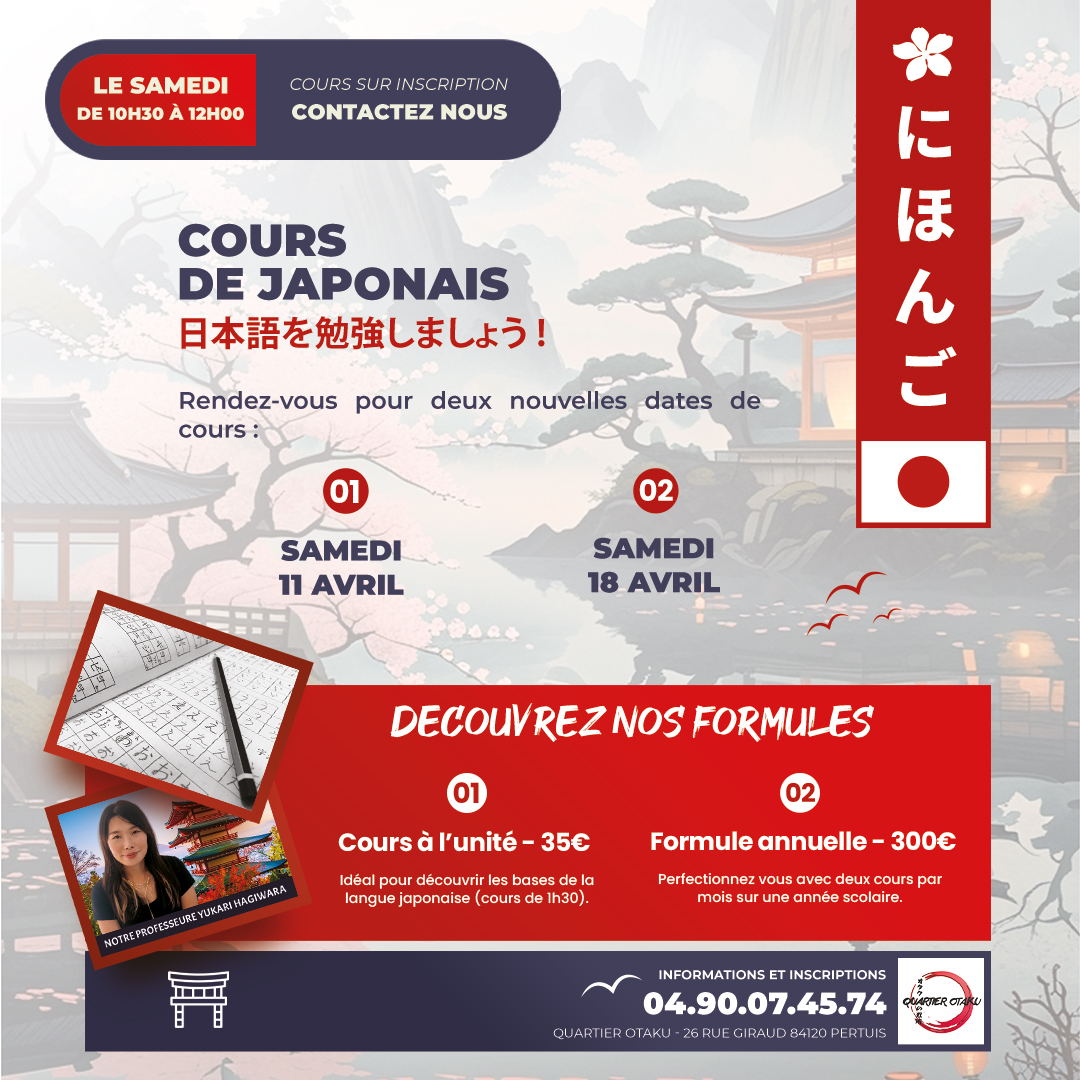 Les cours de japonais se tiendront les samedis 11 et 18 avril de 10h30 à 12h00. Ils vous permettront de découvrir les bases de la langue, d’enrichir votre vocabulaire et de progresser pas à pas dans la compréhension d’un univers linguistique fascinant. Ces séances offrent un excellent équilibre entre apprentissage et mise en pratique, idéales pour toute personne désireuse de s’initier ou d’avancer dans son parcours.